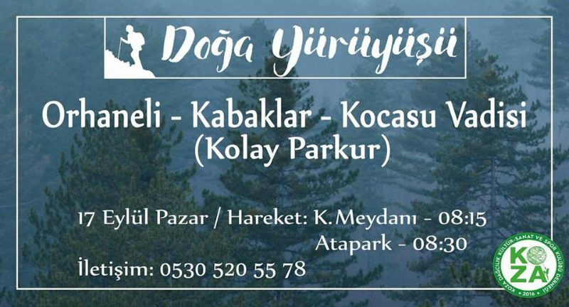 Orhaneli – Kabaklar – Kocasu Vadisi faaliyeti Koza Dağcılık, Kültür Sanat ve Spor Kulübü Derneği tarafından gerçekleştirilmektedir.*